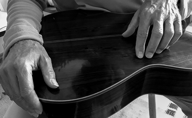 Ja das mache ich gern. Da ist gleich am Anfang der Partitur etwas, wenn Larisa schreibt „intense finger tap; both pitches should be audible“. Nur mit dem kräftigen Aufschlagen des Fingers der linken Hand soll also ein Zweiklang entstehen. Das ist man als Gitarrist so gar nicht gewohnt, mit einer Aufschlagbewegung zwei Töne zu erzeugen. Normalerweise benutzt man diese Art der Tonerzeugung bei einer Bindung, was heisst, ich schlage den ersten Ton mit der rechten Hand an den zweiten erzeuge ich nur mit Hilfe der linken Hand. Hier ist es so dass ich nur mit der linken Hand eine Bewegung machen soll und dabei sollen zwei Töne erklingen. Das geht, weil man es so machen kann, das beide Teile der abgegriffenen Saite schwingen. Ein Ton schwingt rechts vom Finger der linken Hand der andere links davon. Das erfordert ein ständiges gutes Hinhören und man muss sich immer wieder fragen, ob tatsächlich zwei Töne erklingen. Das ist eine schöne Erfahrung, wie Larisa immer wieder neue Klänge sucht, denen ich nachspüren darf. Interessant ist zum Beispiel auch, wie durch das Entlangstreichen des Nagels der rechten Hand am Steg der Gitarre der Klang eines südamerikanischen Rhythmusinstruments, des Guiro, nachgeahmt wird. Und natürlich das Hören auf die Vierteltönigkeit, die wir ja so gar nicht gewohnt sind. Zwar höre ich sehr gern indische Sitar-Musik oder pakistanische Sufimusik, wie z.B. von Nusrat Fateh Ali Khan, aber wenn man dann selber Vierteltöne differenziert, ist das schon eine Herausforderung.